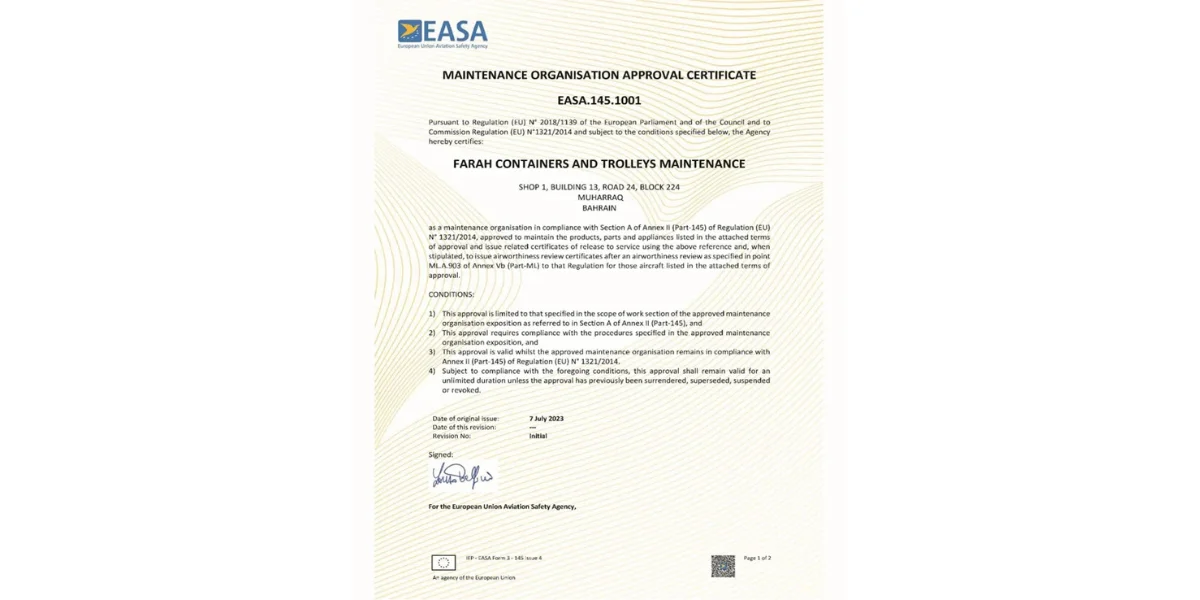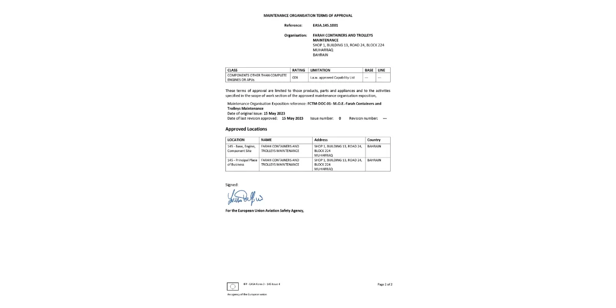 Farah Containers and Trolleys Maintenance (FCTM), established on December 14, 2010, specializes in the repair, assembly, and maintenance of all types of Unit Load Devices (ULDs), including air cargo containers, pallets, and restraining nets for both wide and narrow-body aircraft.